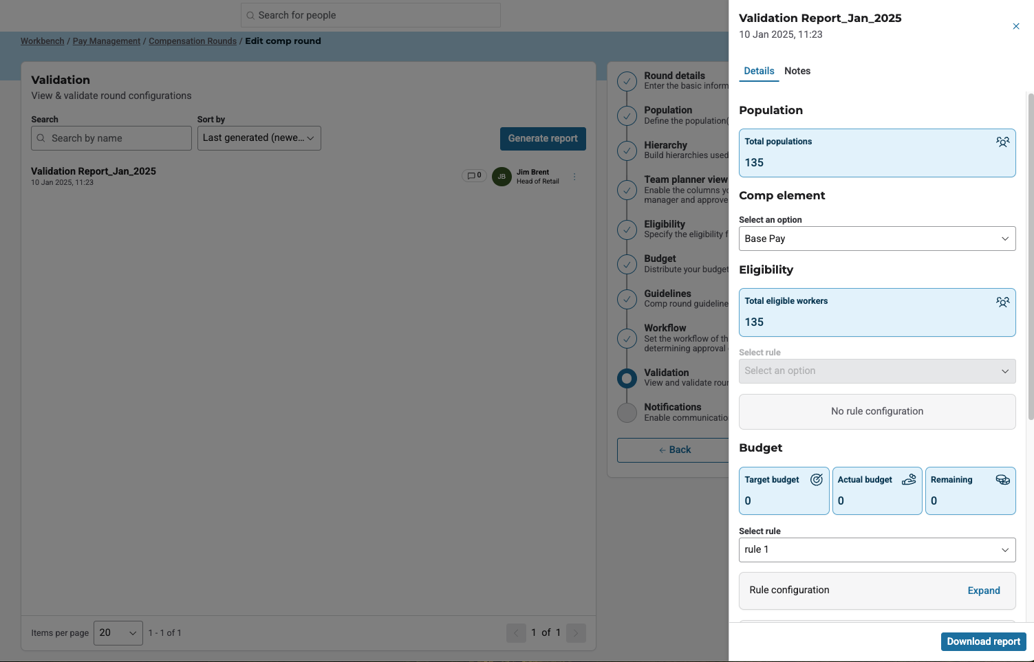 The validation report now generates a comprehensive data summary for the compensation round. It lists all workers along with the fields included in the data model linked to the compensation round. Additionally, it provides detailed information on each compensation element, including the budget and guidelines per every element.