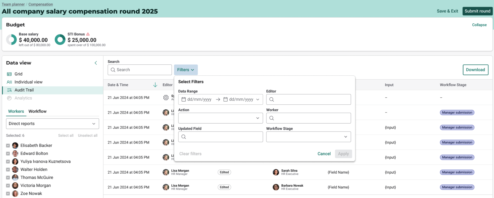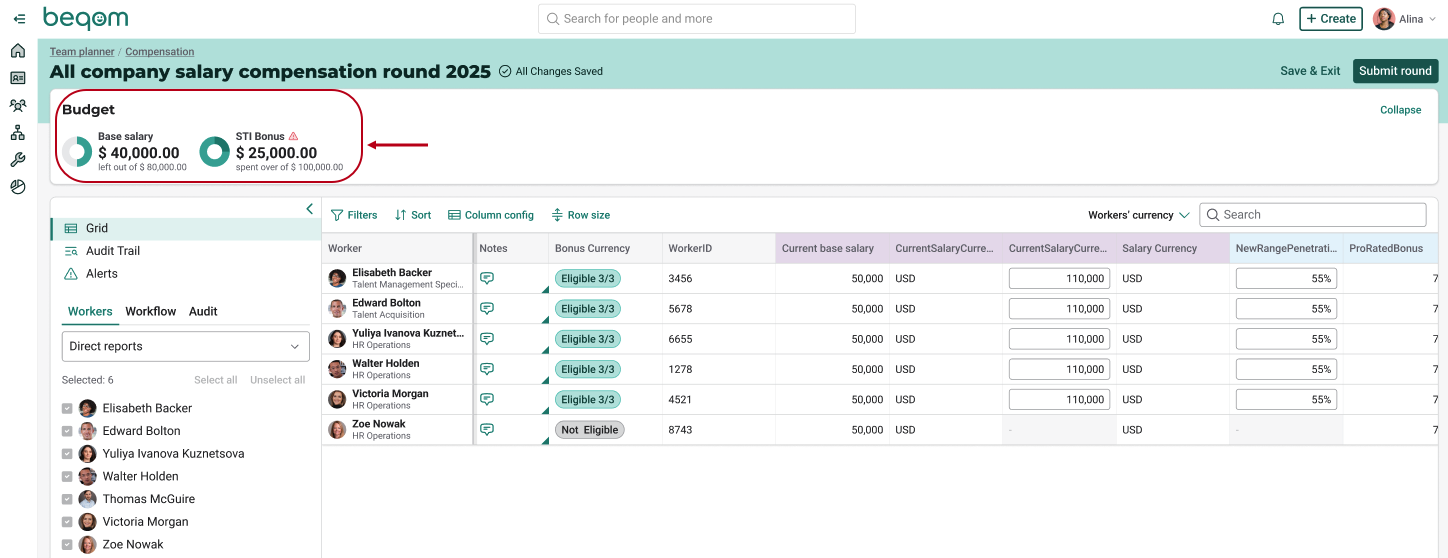 Planner now includes an audit trail for each compensation round, capturing a detailed record of all changes made. It notably tracks:
