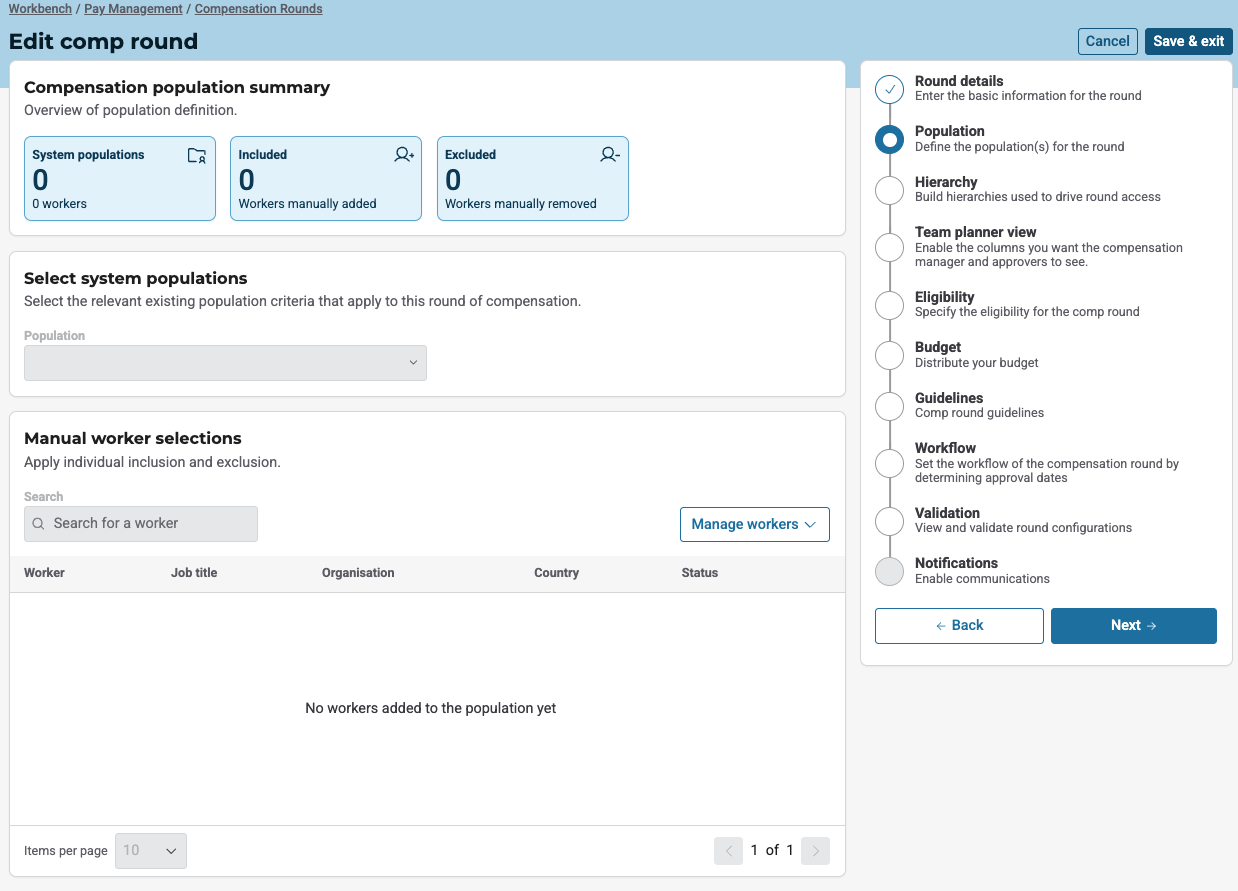 The Population step in the compensation round configuration has been updated to leverage the Population service of the Pay Suite application. At the moment, the page functions as a front-end-only interface. Until the Population service is fully integrated, all workers are included in the compensation round by default; workers need to be manually excluded from the comp round.