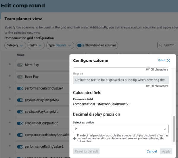 With the 1.6 release, users with the compensation admin professional role are also able to set the necessary decimal precision for all the fields of type 'decimal' while configuring the Team planner view step of the compensation round. The Configure column pop-up is presented on the illustration below: