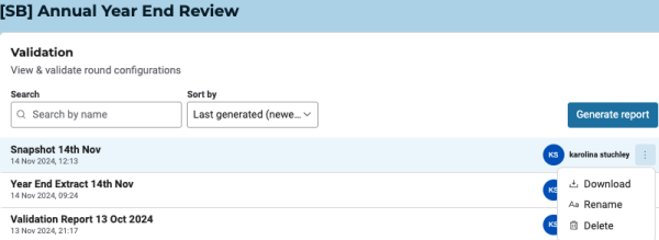 The possibility to generate a validation report exists for published and in progress compensation rounds in both view and edit modes.