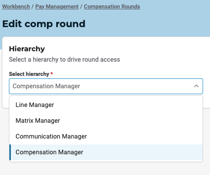 Before 1.6 release, the Hierarchy step of the compensation round contained a preselected hierarchy: the Standard hierarchy. From now on, users with the compensation admin professional role are able to select which hierarchy should be applied for the compensation round.