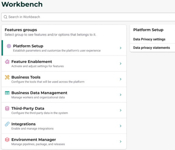 The data privacy settings located under Workbench > Platform Setup are now divided into two separate sections: