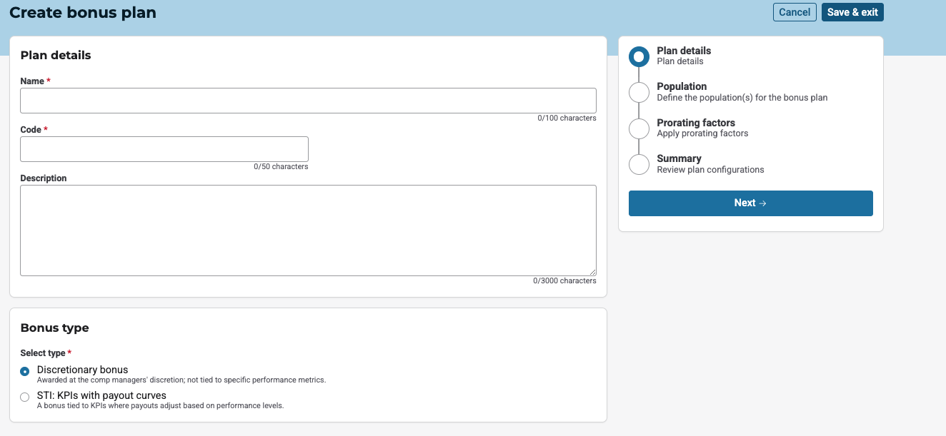 At the moment, the only options in the bonus plan are Save & exit or Cancel. Save & exit creates the bonus plan in Draft status. The rest of the functionality will be released with the next version.