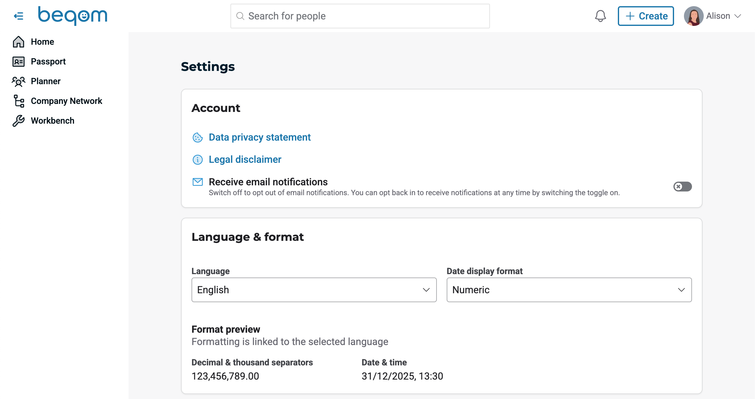 The User settings page was improved in this release. It now contains a section called Language & format where the user can select the language and adjust the date display format, as illustrated in the following figure: