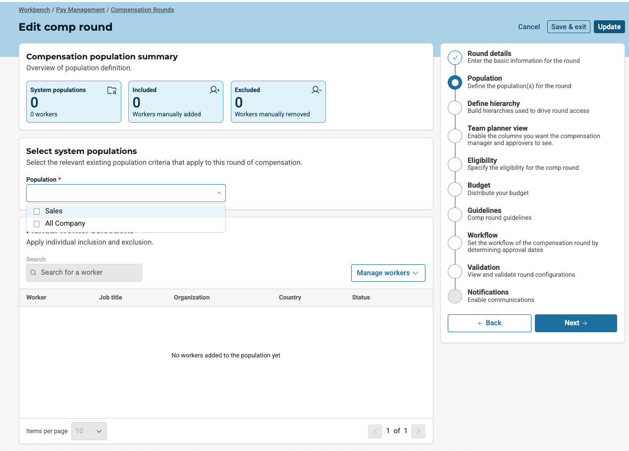 The Compensation population summary section does not yet display a count, but this functionality is set to arrive in the next release. Additionally, the ability to include or exclude individual workers will be introduced soon, offering even greater flexibility in defining compensation populations.