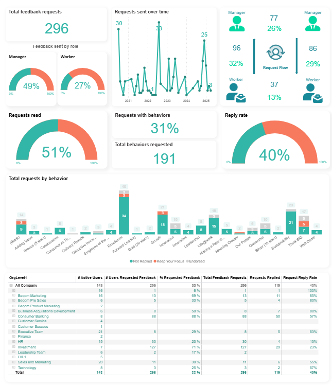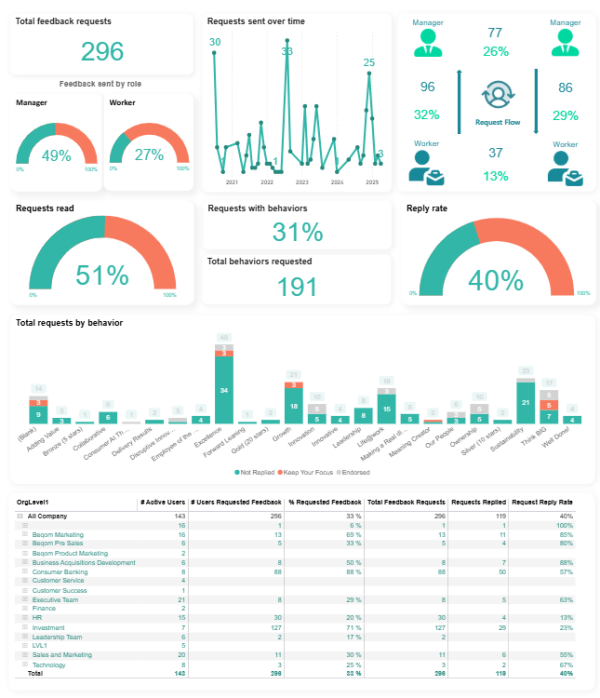 | Requests sent by role | Compares the percentage of feedback requests coming from managers versus those coming from workers. | |