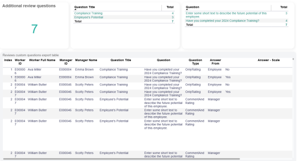 | Review custom questions export table | A table with all custom questions created for reviews in the application. |