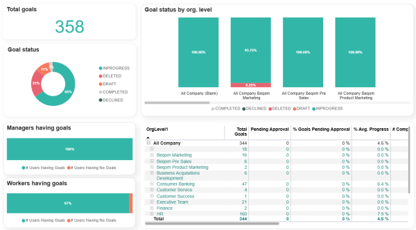goal status by org level (%) | The goals statuses divided between organizations in your company. |