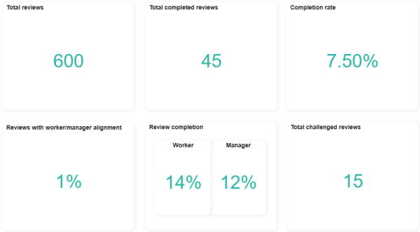| Review completion | The percentage of reviews completed by workers and managers respectively. | |