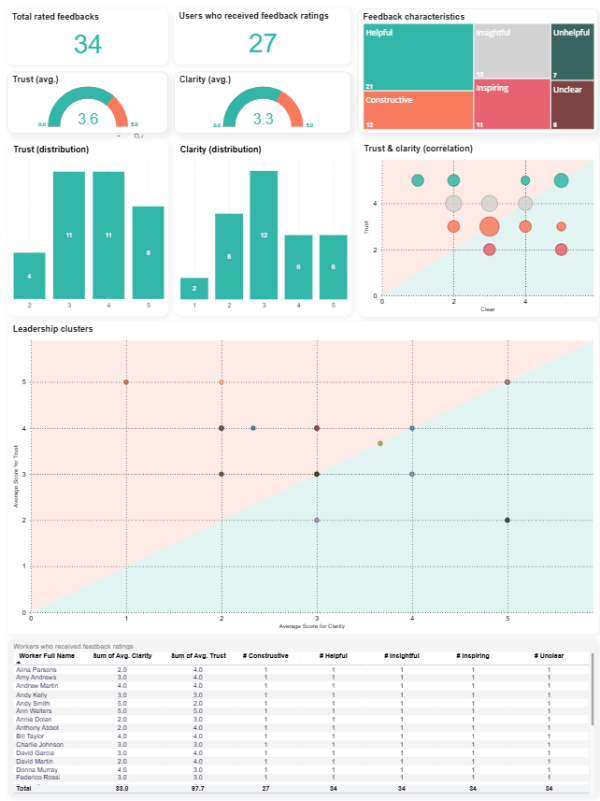 | Leadership clusters | Positions each individual according to their "average Trust score" on the y-axis and "average Clarity score" on the x-axis. Each dot represents a person, allowing you to see at a glance whether they tend to receive high scores for both trust and clarity (upper-right cluster) or if there’s an imbalance (e.g., high trust but lower clarity). The background’s diagonal shading helps visually separate the chart into two regions—those above the line (higher trust relative to clarity) and those below the line (higher clarity relative to trust). | |