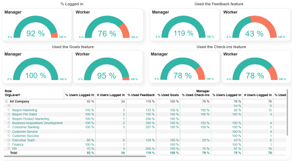 | Manager | % managers having used the goals feature | A visual that shows what fraction (in %) of all workers have used the goals feature in the application at least once. |