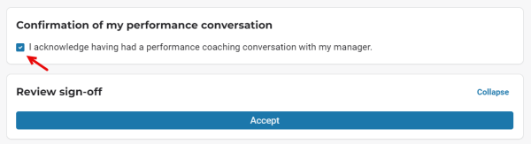 After the Conversation & publication stage has been completed, the final step of the performance review process is to accept the completion of the review.