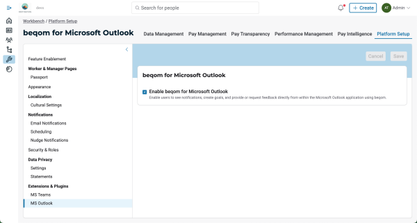 For Outlook, click MS Outlook in the Platform Setup menu. In the page that is displayed, check the Enable beqom for Microsoft Outlook box.
