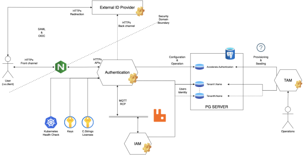 After the redirection to the external identity provider, the exchange of credentials across the two security domains can take place according to either OIDC or SAML. The actual protocol used depends on the settings stored per tenant in the configuration database. Each tenant can register one or several identity providers, and enable form authentication.