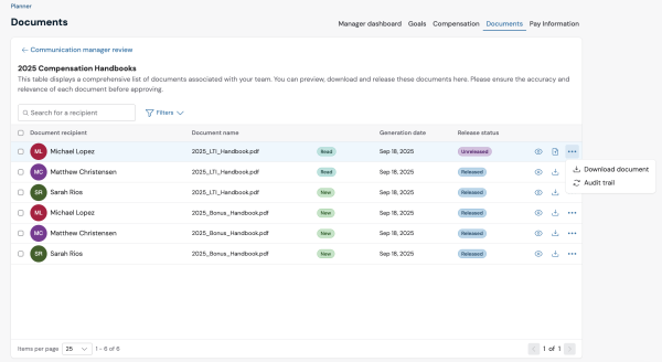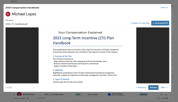 In the Documents section of the Planner, users with Compensation Manager and HRBP professional roles can view and manage all the documents concerning their team or within their scope, respectively. These documents can be for instance compensation letters or performance documents.