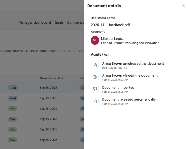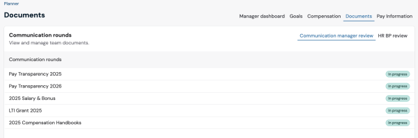 The Documents tab includes the Communication manager review and HRBPÂ review sub-tabs that display all the available Communication rounds. To inspect a communication round, click the row with the name of your chosen round. You are now redirected to this communication round page that contains a comprehensive list of documents associated with your team. Depending on your role, you can upload, preview, download, release, unrelease, or delete such documents. The page also offers an audit trail for each imported document, providing a detailed record of all changes made.