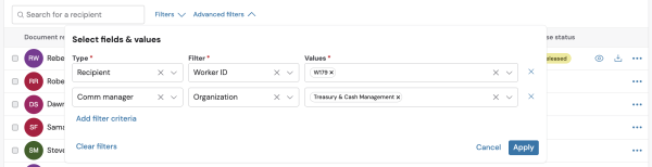 If you are an HRBP, you additionally have the Advanced filters option, which enables document filtering based on Recipient and Comm manager types. HRBPs can filter by attributes, such as Worker ID, Organization, Region, Country, State, City, and Cost center, using value lists for each, as illustrated in the following figure: