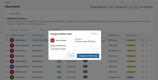 As an HRBP, you have the ability to change the workflow step to route a document to a Communication Manager for additional review before release. This applies to documents with the Not released release status. To do so, click the Change workflow step icon located at the far right of a relevant row in the document table. Next, you will see a pop-up, where you can choose your Target workflow step from the drop-down list. Confirm, clicking the Change workflow step button, as shown in the following figure: