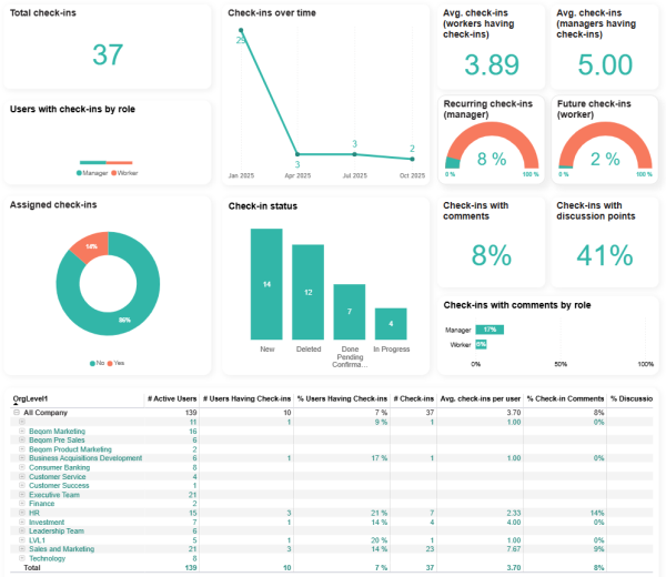 % users with check-ins by role | The comparison of the percentage of workers and managers having at least one check-ins relative to the total number of workers and managers respectively. |
