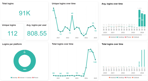unique logins over time | The number of all the unique logins to the platform during a specified timeframe. |