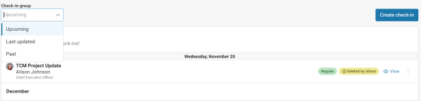 In My check-ins section click on the drop-down list at the top to see your Upcoming, Last updated and Past check-ins, as illustrated below:
