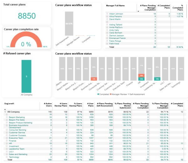 The Career plan status report page provides a detailed view of career plan workflow status, broken down by organizational unit and user. It allows for hierarchical drill-down to monitor progress at different levels, and includes tables grouping users by manager to show pending and completed plans. Additionally, users can review workflow status across teams and departments, as well as a summary of refused plans with organizational drill-down, culminating in a detailed table of individual user career plans.