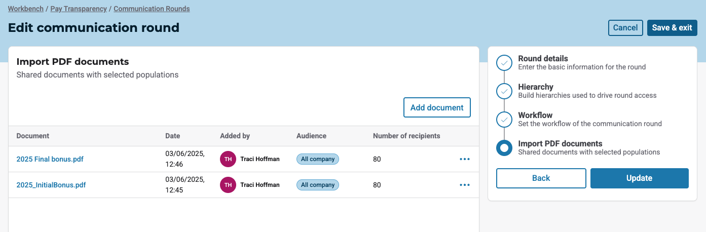This release introduces a new level of visibility for manually imported documents within communication rounds. Global compensation administrators and communication round owners can now view a detailed list of all manually imported documents, offering greater transparency and control over content that is distributed manually, particularly for one-off exceptions or targeted communications.