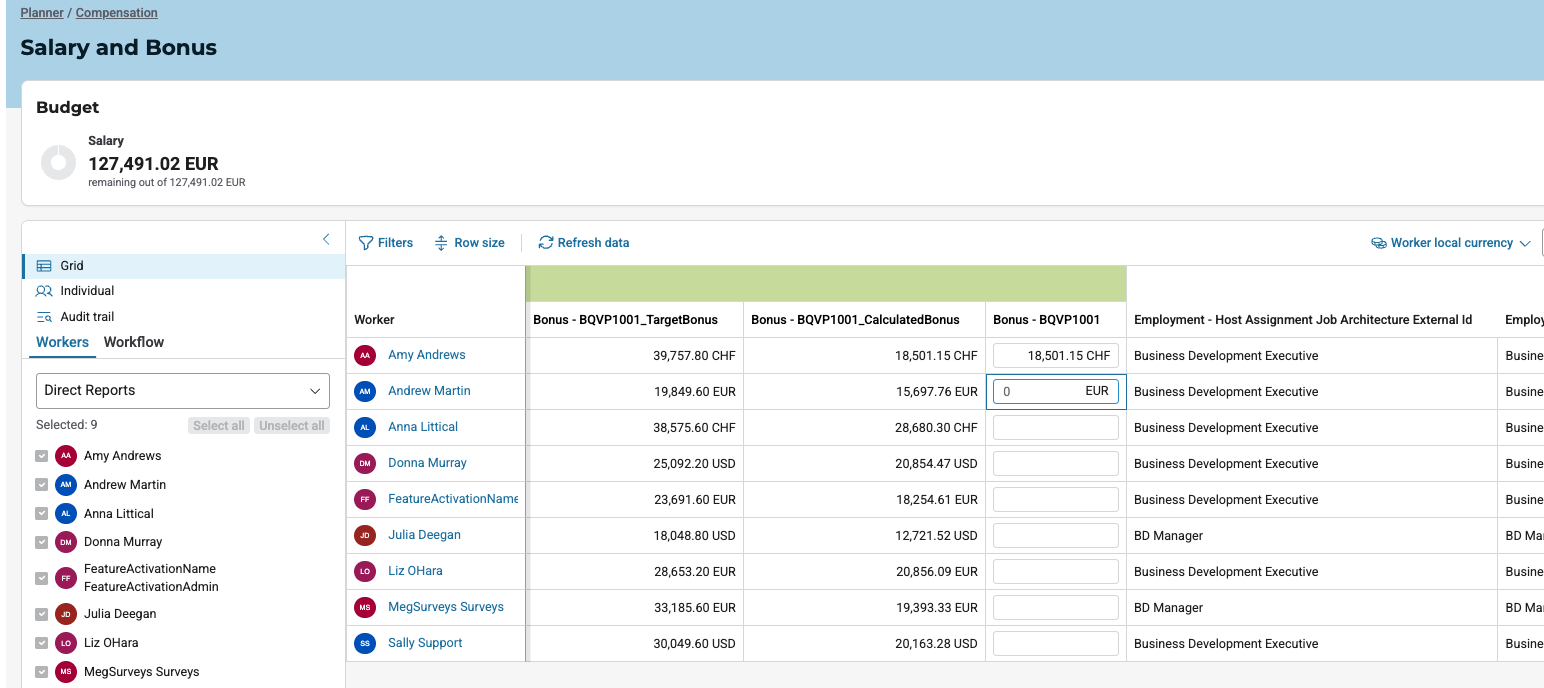 This feature provides role-based visibility, making it available for both managers and HRBPs directly within the planner interface, where it displays bonus details specific to each worker. The displayed bonus data for each worker's row includes: