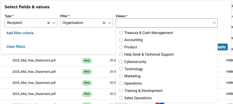 We've significantly improved the advanced filtering interface within the Planner, specifically in the Document and Communication Round sections. The drop-down lists for filtering values now fully support larger sets of options without truncating their names, as illustrated in the following figures: