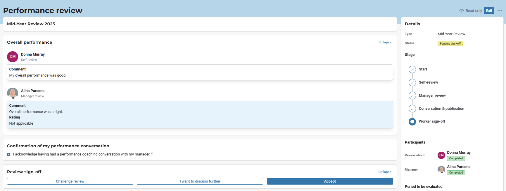 Before signing off on your performance review, you'll need to confirm that a performance coaching conversation with your manager has occurred. This action will activate three options, as illustrated in the following picture: