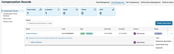 Choose a compensation round you want to work with. Keep in mind that Payroll data drop is available only for comp rounds that are in the "In progress" state.