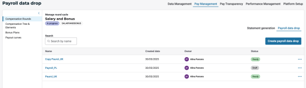 In this page you are able to manage the payroll data drops that were already created for your chosen comp round.