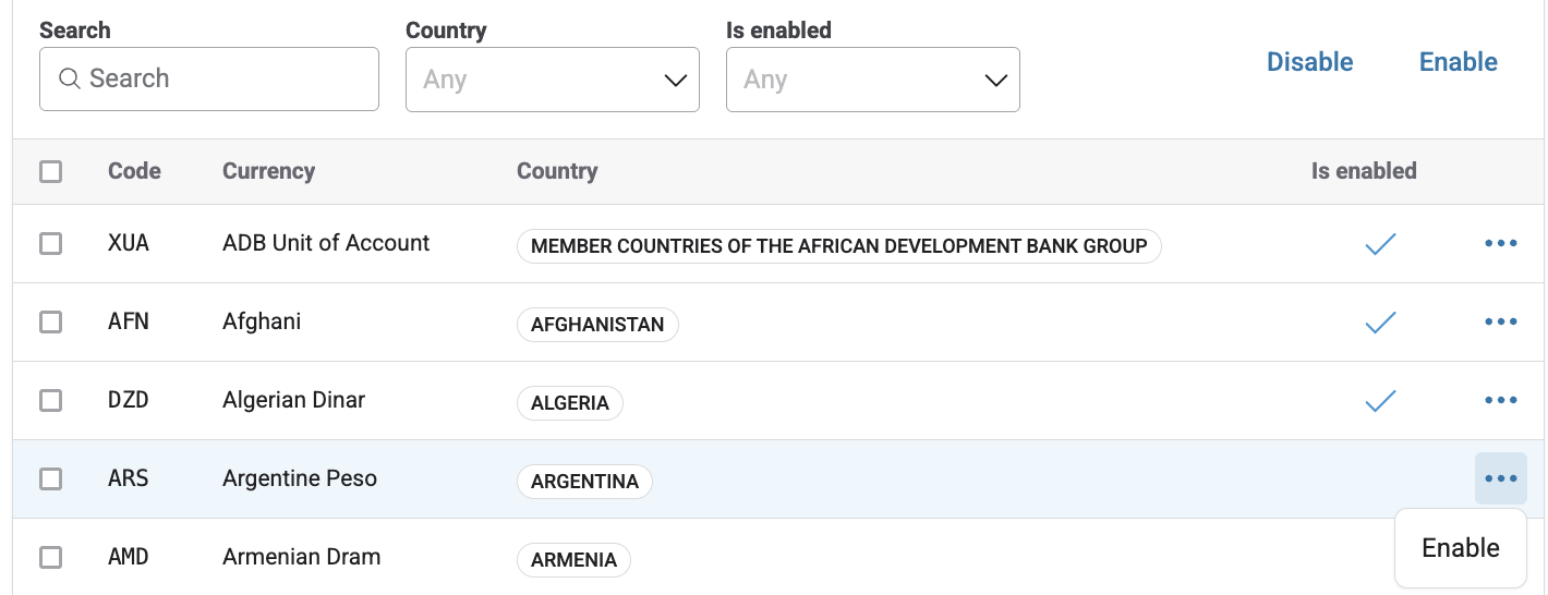 Active Currencies are the currencies made available for use across the application's various features; multiple currencies can be activated.