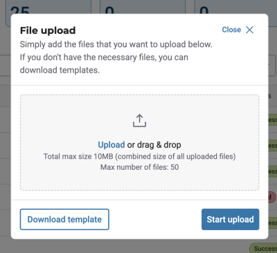 Alternatively, you can also click the Upload CSV button located in the top right corner of the page. In the File upload window, click Download template.