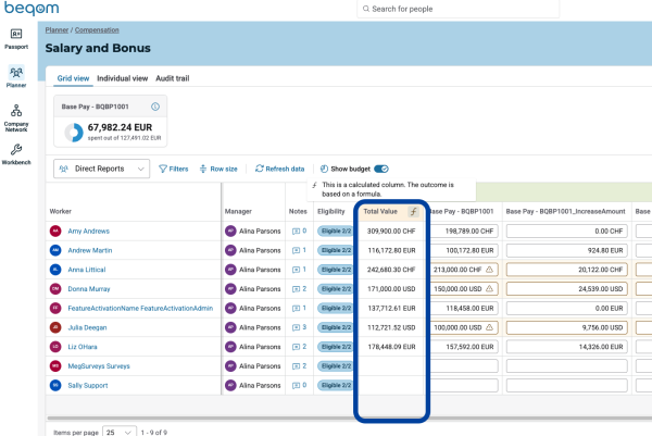 The Calculated columns feature introduces dynamic formula-based calculations directly within the Planner grid. Compensation Admins and Global Comp Admins can now configure new columns using an Expression builder to perform real-time calculations based on existing data in the compensation round. This allows for better insights, automation, and support for advanced compensation strategies.