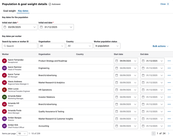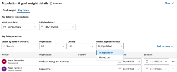 A new Key dates tab has been added to the Workbench > Performance Management > Goal Management > Population, as illustrated in the following image: