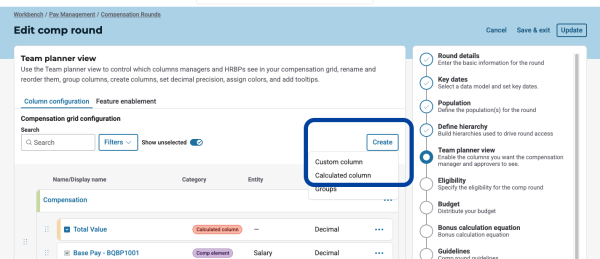 This feature is accessible underWorkbench > Compensation Management > Compensation Rounds > Team Planner View > Add Calculated Column, as presented in the following illustration: