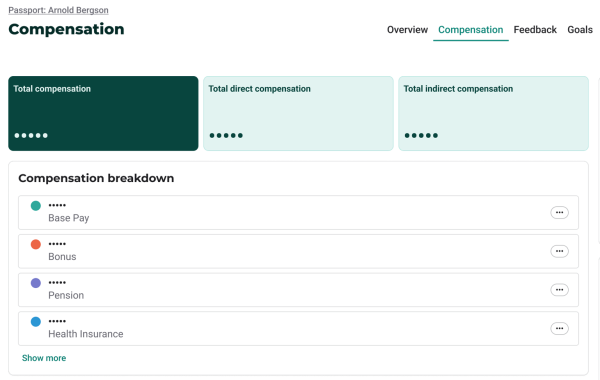 Sensitive compensation information—such as total, direct, and indirect compensation, and breakdown values—is now hidden by default when an employee opens their Digital Reward Statement. When this information is hidden, numeric values are replaced with placeholders (•••••), and certain compensation widgets (e.g., historical compensation, recent salary changes) are not displayed, as illustrated in the following image: