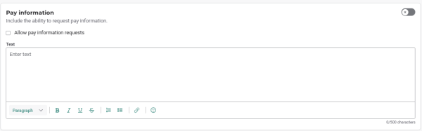 The card can be configured in Workbench > Platform Setup> Passport > Compensation > Digital reward statement after clicking the Edit button. By default, the card is disabled and hidden from end users in the Digital Reward Statement. Users with Configuration role can enable/disable the card, add rich text content (up to 500 characters), and decide whether to allow "Pay Information requests" for workers, as shown in the following picture: