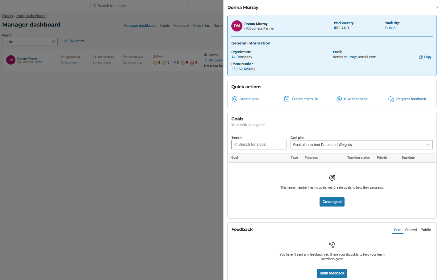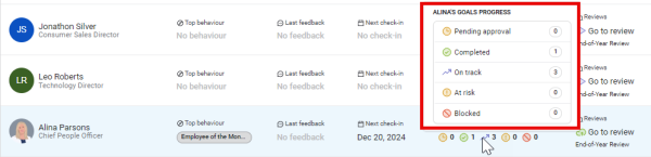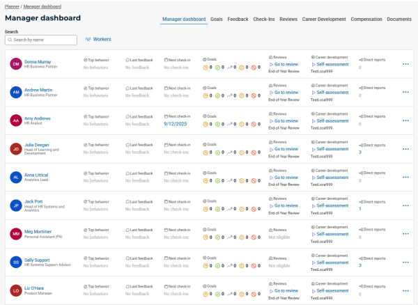 As a manager, with the Manager dashboard section of the Planner, you have access to a dashboard in which each of you direct reports is visible with useful information such as workers' goal overview or top behaviors and other actions available, as illustrated in the figure below:
