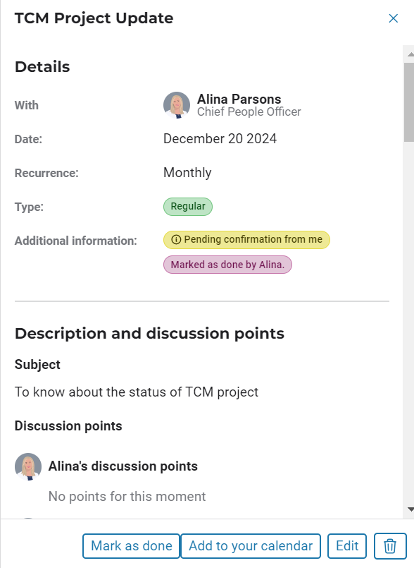 Click on the buttons located at the bottom of the pop-up to mark the check-in as done, add it to your calendar, edit it or click the button to delete the check in.