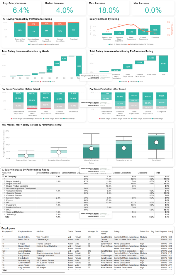 The Pay & Performance report page provides a comprehensive analysis of the relationship between employee performance ratings and salary increases throughout the organization. It presents key metrics such as average, median, minimum, and maximum salary increases, broken down by performance rating. The report allows users to analyze the percentage of employees receiving proposals by their performance rating and visualize the distribution of salary increases across different performance tiers. Furthermore, it includes a detailed breakdown of average salary increases by both job grade and performance rating, culminating in a detailed table of individual workers, which can be filtered to understand pay and performance data at the employee level.