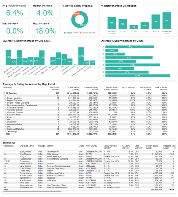 employee id employee name manager job title grade work country salary increase category % salary increase local currency # current salary (local) # proposed salary (local) # increase amount (local) # current salary (annualized) # proposed salary - annualized (local) global currency # current salary (global) # current salary annualized (global) # proposed salary (global) # increase amount (global) % avg. goal progress latest EOY performance rating manager id manager name org level |
