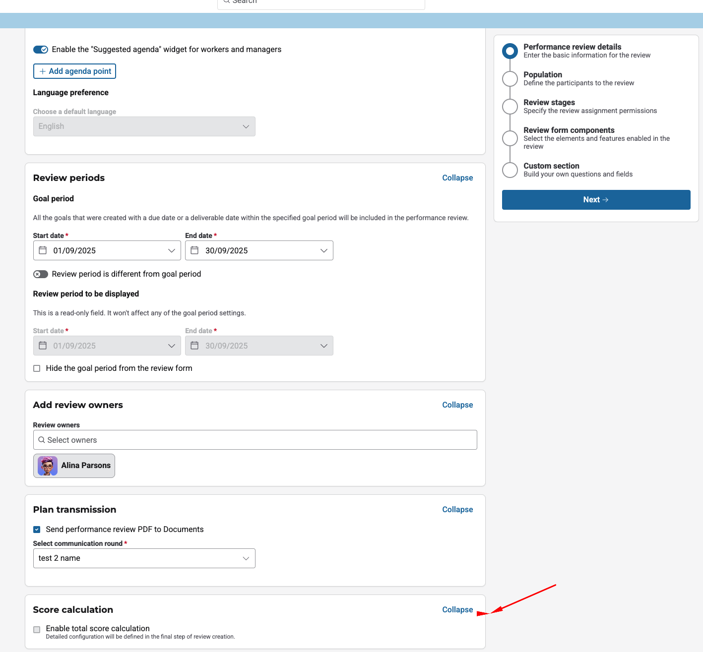 Administrators can now enable score calculation while creating or editing a review template, as illustrated in the following image: