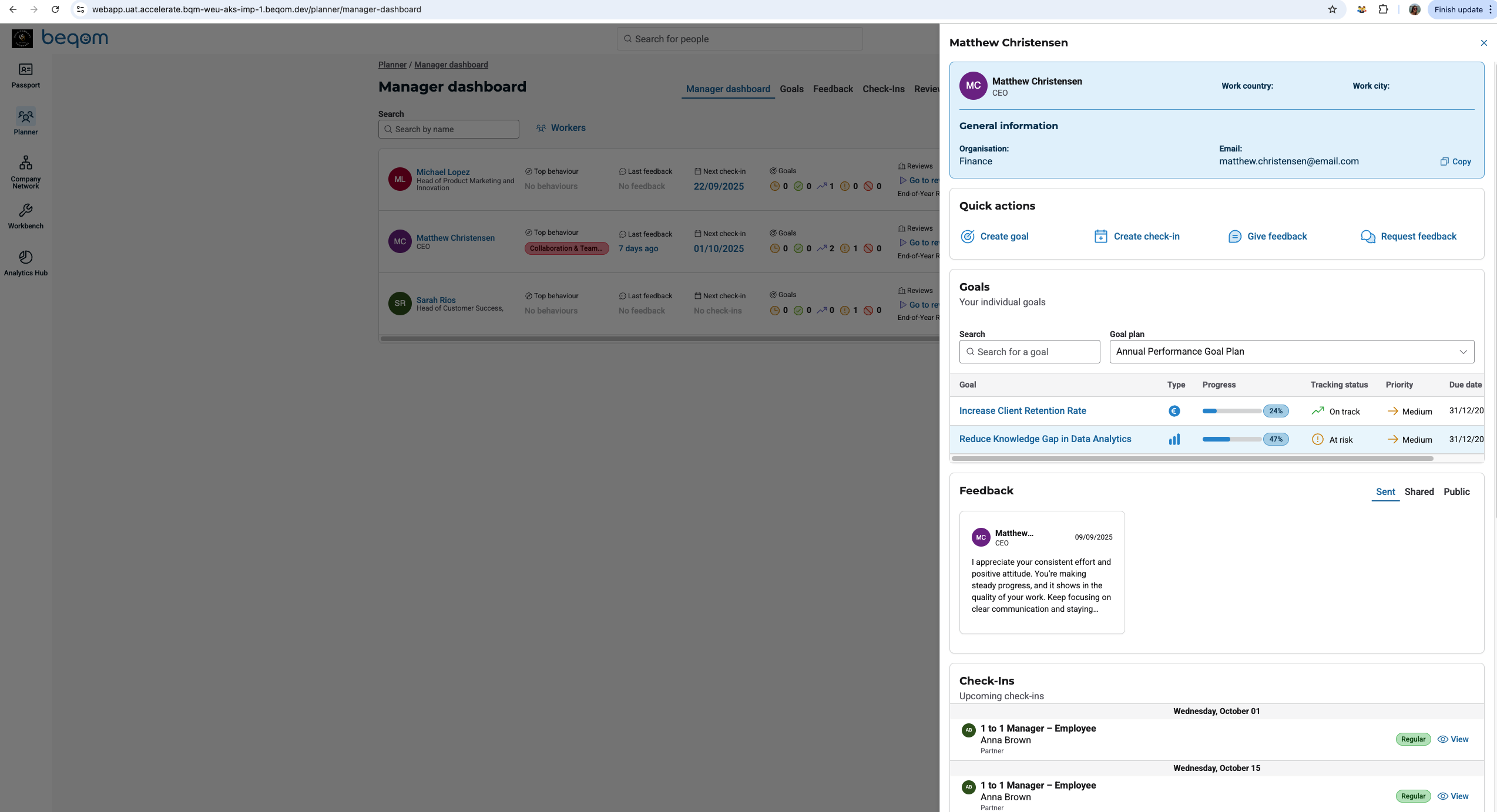 You can now click on an employee's name directly from the Team Dashboard to open their full summary view. This new feature provides faster access to individual review data and allows for a one-click drill-down into key performance insights, as shown in the following picture: