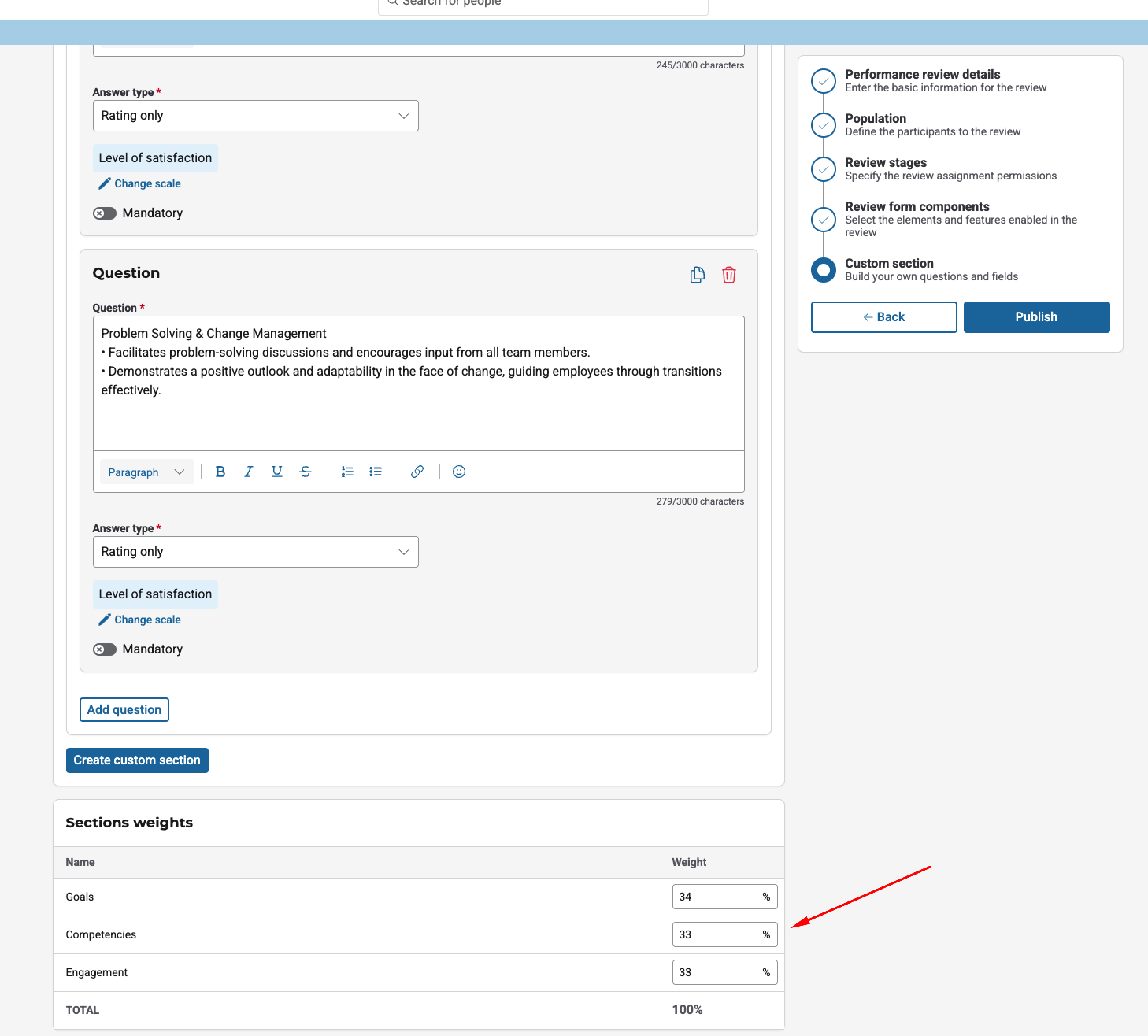 Within a score-enabled template, administrators define which sections will contribute to the total score. Common sections include Goals and custom widgets that contain rating questions. Each of these sections must be assigned a weight (e.g., 33.3% each), with the total weight for all sections equaling 100%. The system will validate this total before allowing the template to be published, as illustrated in the following picture: