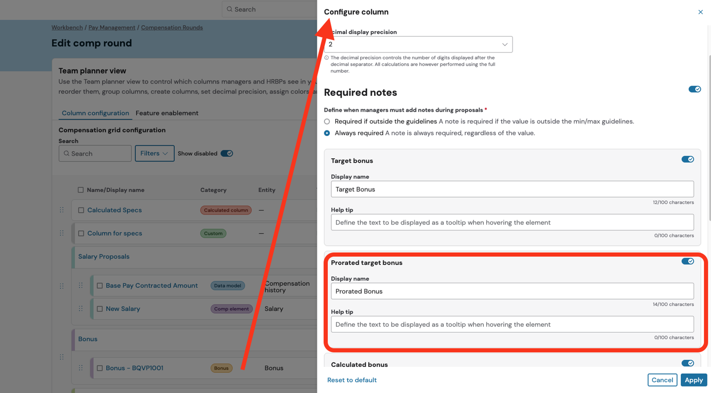 This new display option brings prorated target bonus values directly into the Planner, enhancing transparency and accuracy in bonus reviews. When both Time in role (TiR) and Leave of absence (LoA) factors are configured in the bonus plan, the feature ensures accurate visibility of target bonuses that have been adjusted to reflect each worker's unique situation. By displaying these real prorated values, reviewers can make more informed decisions with compensation data that truly represents individual circumstances.