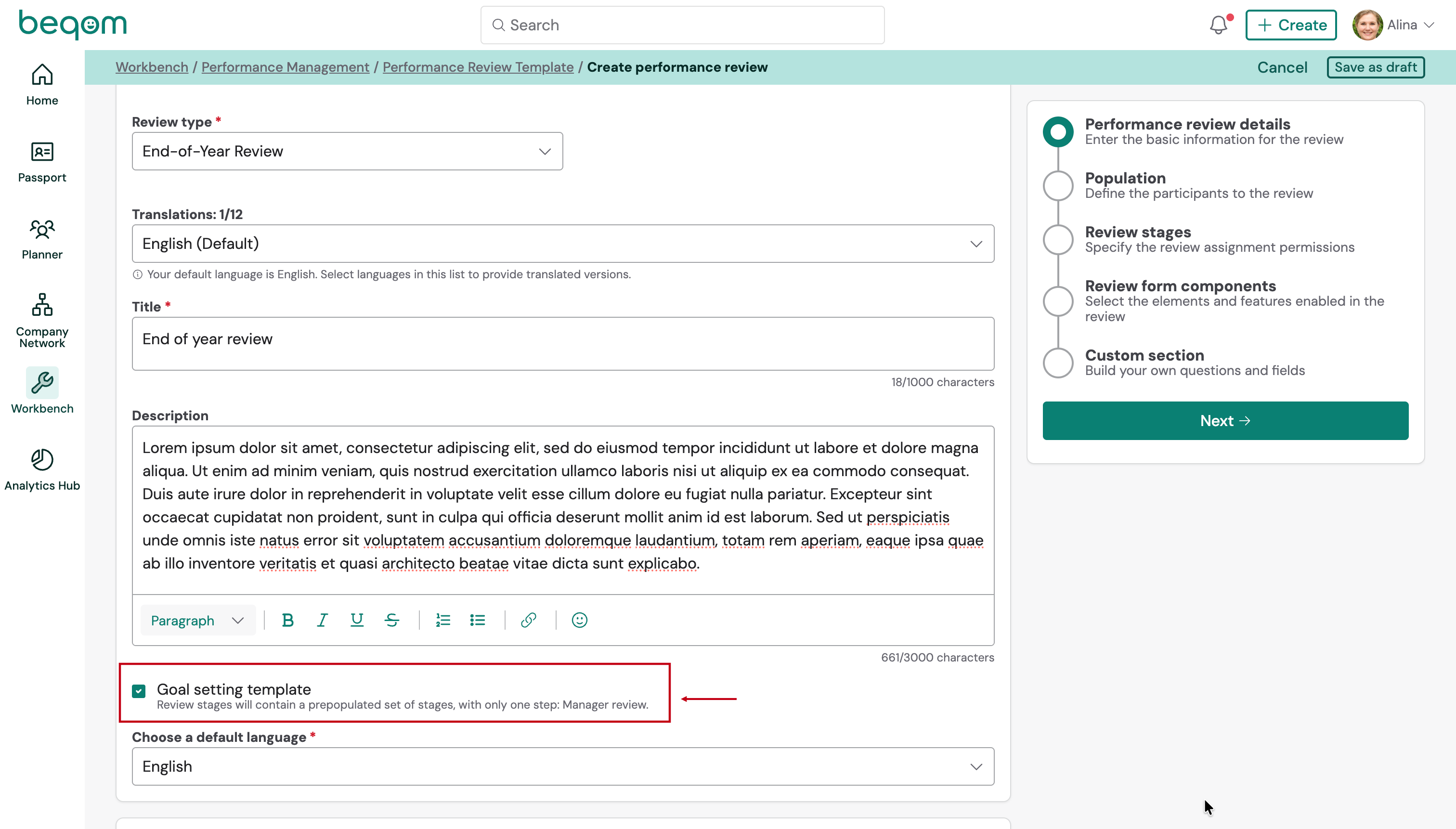 In terms of activation, a new setting, Goal setting template, is now available in the Performance review details step of the review template configuration wizard, under Workbench > Performance Management > Performance Review Templates. When this setting is enabled, the system applies the goal setting flow to the template.