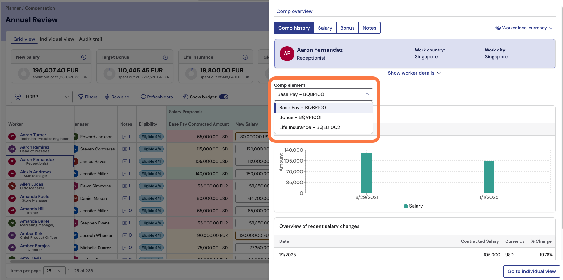 Compensation administrators can now configure which compensation elements are displayed in the Worker compensation history section within the Planner drawer.